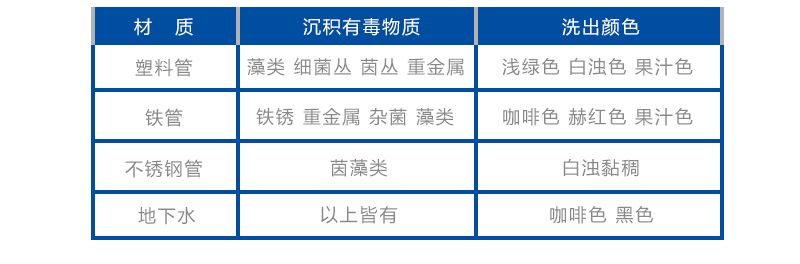 每一種材質的水管都會產生積垢現象,塑料管容易屯積菌藻類的臟物,所以洗出來是白濁色或淺綠色或淺黃色,鐵管容易生鐵銹,所以洗出來是咖啡色;如果使用地下水,不管鐵管或塑料管,都可以洗出很黑的臟水。有些建筑物會使用不銹鋼管,但時間久了還是會洗出白濁黏稠的菌藻類。