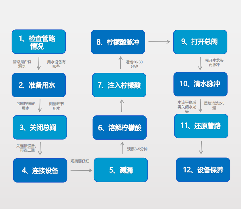 設備對水管內注射安全的食用級檸檬酸熱溶解液,對管壁沉積的污垢、雜菌等進行浸泡,依靠空氣和水為介質,利用水之新公司自主研發的螺旋脈沖清洗技術和高周波脈沖清洗儀的螺旋脈沖對管內壁進行沖擊和震蕩,逐層剝落并快速排出管外,能有效解決自來水管、冷卻和加熱設備系統管道等管道積垢造成的水質差、效能降低、能量損耗等問題問題,同時還可以有效的凈化飲用水用水環境。